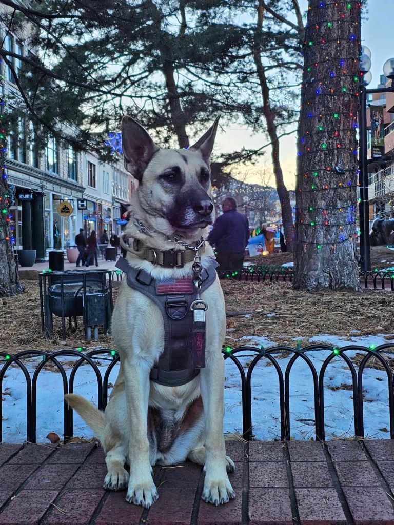 Silver is more based in a “threat assessment” style of work. While displaying calmness, she will keep close observations on surroundings while notifying her handler to the potential of a threat with physical contact (touching paws to the handler) and then signaling to the threat. She has been through PTSD training involving distraction work based in touch and licking the handler’s hands to signify the potential episode oncoming. She is both good on and off the leash and comfortable for whatever situation is faced.